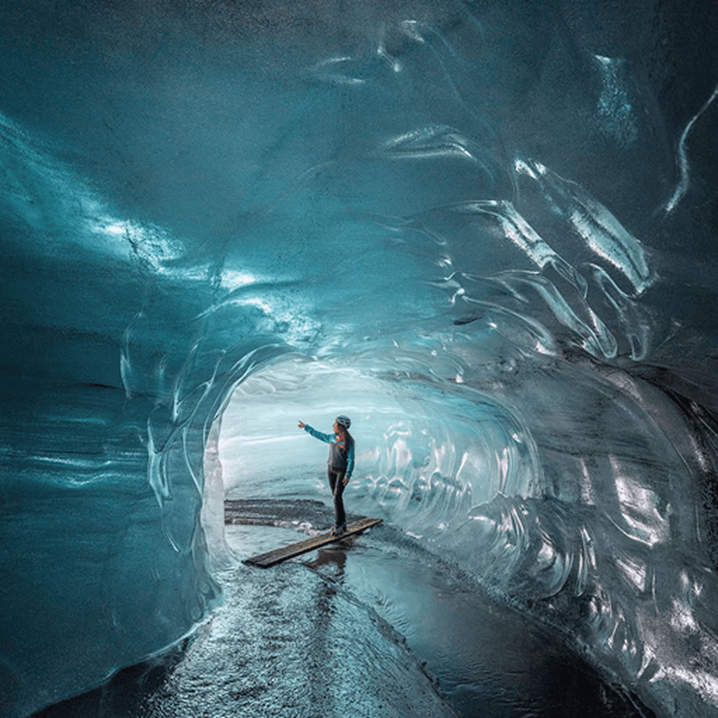 Explorează o peșteră de gheață formată sub un vulcan activ – un contrast spectaculos.